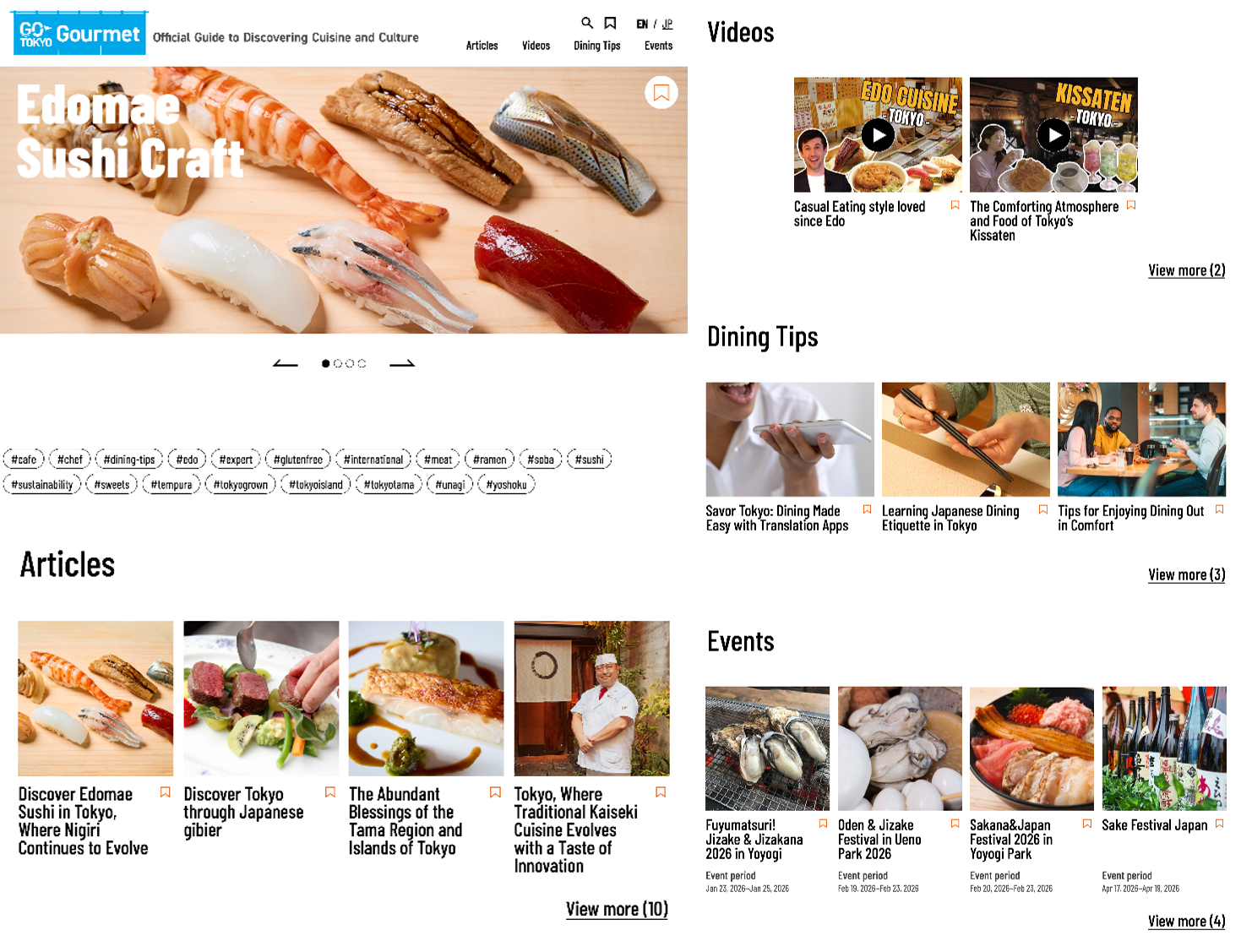 Making Food Experiences More Delicious and ComfortableIn order to make dining experiences more delicious, comfortable and satisfying, the website provides information on how to enjoy Japanese food, as well as unique Japanese services and manners. The site also posts information on food-related events held in Tokyo.