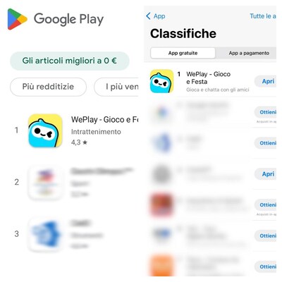 ROMA, 12 febbraio 2026 /PRNewswire/ -- WePlay, la nuova generazione di piattaforma globale di intrattenimento social, annuncia il suo arrivo ufficiale sul mercato italiano. In poco tempo, l'app ha raggiunto la prima posizione nella classifica delle app gratuite sia su Google Play sia su App Store, registrando un risultato di grande rilievo negli store della regione.Questo traguardo rappresenta una tappa fondamentale che segna un'importante accelerazione della strategia di WePlay in Europa, confermando ulteriormente la sua vision di brand: "Attraverso igiochi, uniamo le persone e guidiamo la tendenza globale dell'intrattenimento sociale online"