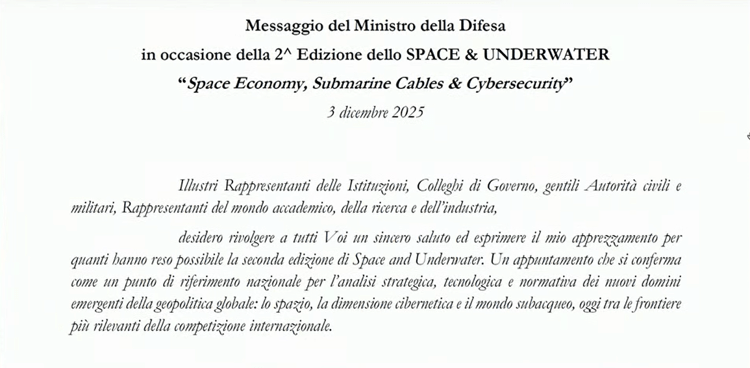 Il Ministro della Difesa Guido Crosetto ha inviato un messaggio sottolineando la centralità strategica dei nuovi domini spaziale e subacqueo